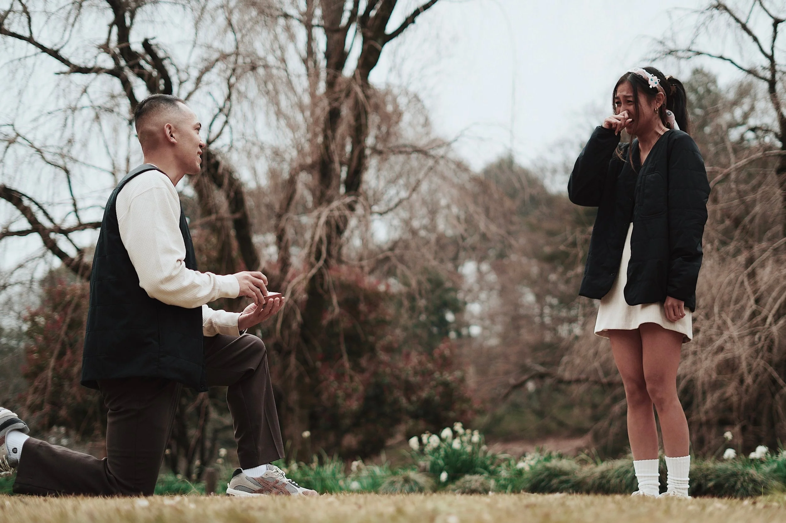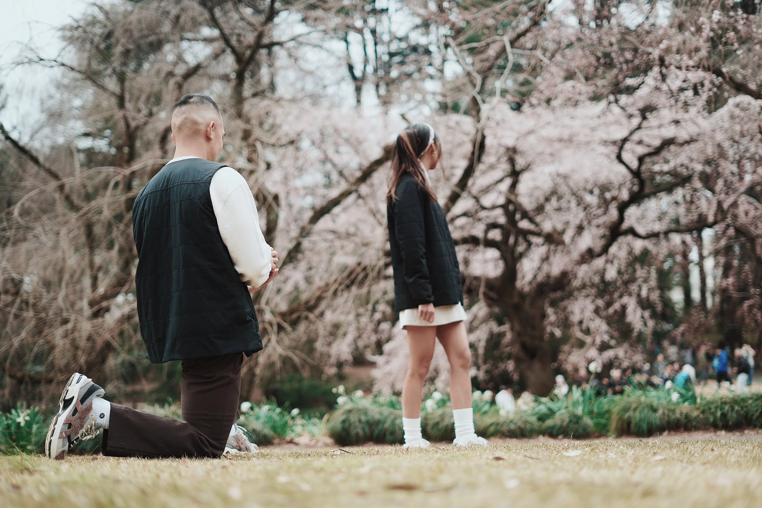 Once travel resumed, Billy was planning to propose during their Japan 2023 trip. But the ring didn’t arrive in time. Friends started wondering: cold feet? Too many arguments in the boat? (Looking at you, Chiyoda Park.) Determined, Billy convinced Jess to return to Japan in 2024 with a secret plan. To help set the stage, our friend Kathy pretended she was planning a month-long stay in Japan and “invited” us to visit her. Jess didn’t suspect a thing. And it was a gloomy March day at Shinjuku Gyoen Garden, with the cherry blossoms starting to bloom, Billy popped the question. Jess said yes, and Billy was (totally not) stressed.😅